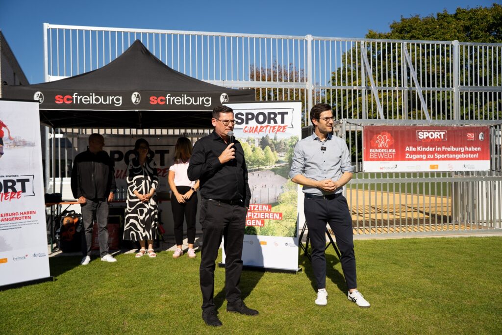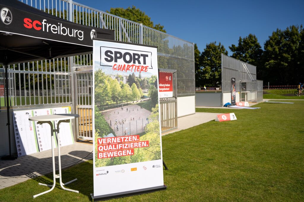 Gemeinsam mit Akteuren vor Ort gestaltet der SC Freiburg hier sein Sport-Quartier Haslach-Weingarten. Ein Sport-Quartier ist ein begrenztes Gebiet (z.B. Stadtteil), in dem der SC Freiburg gemeinsam mit seinen Kooperationspartnern eine Vernetzung von Kindertagesstätten, Grundschulen, Sportvereinen und weiteren sozialen Einrichtungen unterstützt. Zur Eröffnungsparty haben Felix Bußmann und seine Mitstreiter vom Sport-Quartiersmanagement des Sport-Club allerlei Wände mit Plakaten beklebt und eine klare Botschaft vermittelt: „Alle Kinder in Freiburg haben Zugang zu Sportangeboten!“ Mit diesem Anspruch fügt sich das Projekt perfekt in das von den Clubs der Bundesliga und 2. Bundesliga sowie der DFL Stiftung aufgelegte Programm „Bundesliga bewegt“, das Akteure vor Ort vernetzt und Kinder in Bewegung bringt.