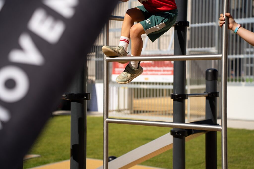 Wer mitmachen will, holt sich bei Felix Bußmann einen Laufzettel ab. Zum Beispiel Frida, sie ist 13 und sagt von sich selbst, „dass ich mir ein Leben ohne Bewegung gar nicht vorstellen kann“. Zur Eröffnungsparty kommt sie mit Charlie. „Meine Cousine, sie ist vier Jahre alt“. – „Nein, viereinhalb“, kräht Charlie und zerrt an Fridas Hand. Nichts wie weiter! Fünf Stationen sind zu absolvieren, und am größten ist der Andrang rund um den vom Mountainbike-Club Freiburg betreuten Pumptrack. Aber auch die Basketballerinnen der Freiburger Eisvögel und die Klimmzug-Spezialisten vom Black Forest Movement geraten nicht in die Verlegenheit von Langerweile. Der Sport-Club betreut das Trampolin und, na klar!, den Fußballplatz. Vorstand Oliver Leki sagt: „Als SC Freiburg möchten wir gezielt in die sportliche Entwicklung von Kindern und Jugendlichen investieren. Das Thema Bewegung für junge Menschen beschäftigt uns weit über den Profisport hinaus.“