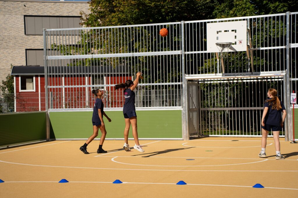 Auch auf dem sanierten Bolzplatz an der Staudinger Gesamtschule soll der Sport seine integrative Kraft entfalten. Wo früher mal eine große graue Aschefläche war, präsentiert sich heute ein 2.600 Quadratmeter großer Komplex, für den der Terminus „Bolzplatz“ beinahe schäbig klingt. Es gibt zwei Fußballkäfige, einer davon ist zusätzlich mit Basketballkörben ausgestattet. Das sechs Meter lange Trampolin ist auch für Rollstühle geeignet. Ein Calisthenics-Park bietet allerlei Stangen für eine Mischung aus Akrobatik und Geräteturnen. Und ganz vorn, gleich neben Freiburgs erstem öffentlichen Boxsack, windet sich ein Pumptrack durch das Grün, ein spektakulärer Rundkurs für Mountainbiker.