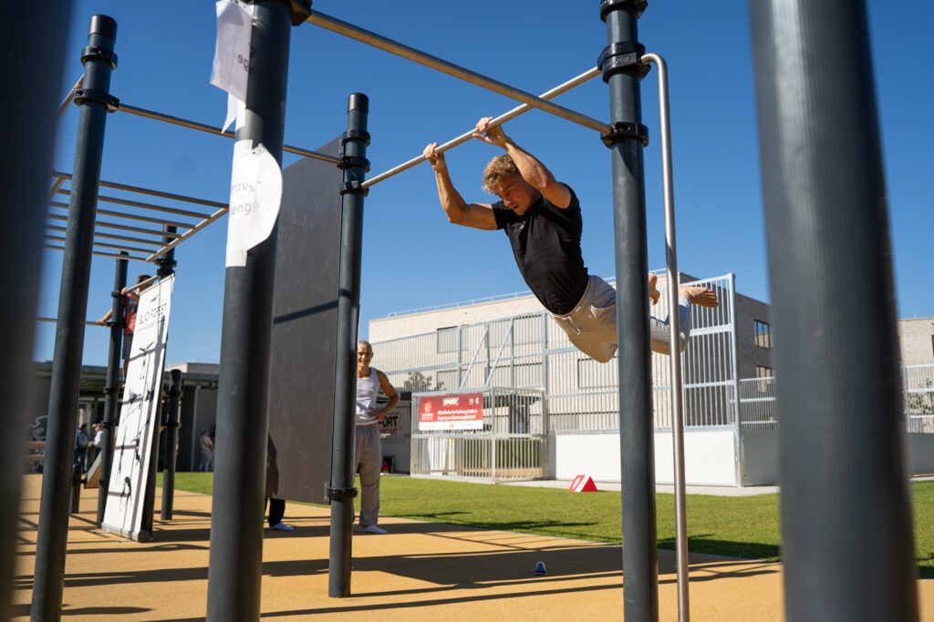 Das  Wetter ist so schön und die Stimmung so gut, da will sich der Oberbürgermeister nicht lange bitten lassen. Also legt Martin Horn das Jackett ab, er krempelt die Ärmel hoch und schon sein erster Auftritt an der Klimmzugstange ist so überzeugend, dass das Publikum in Verzückung gerät. Applaus! Das Publikum besteht aus geschätzt 200 Mädchen und Jungen zwischen vier und vierzehn, aufmerksam beobachtet von Eltern und Großeltern, die mindestens genauso viel Spaß haben wie die lieben Kleinen. Es gibt etwas zu feiern! Ja, auch die Klimmzüge des OB, vor allem aber die Einweihung des Staudinger Bolzplatzes.